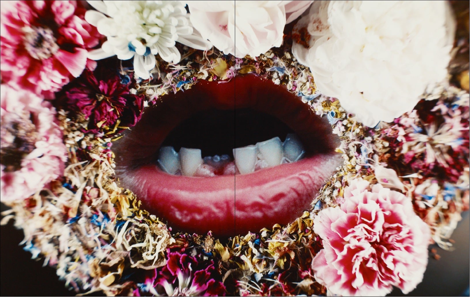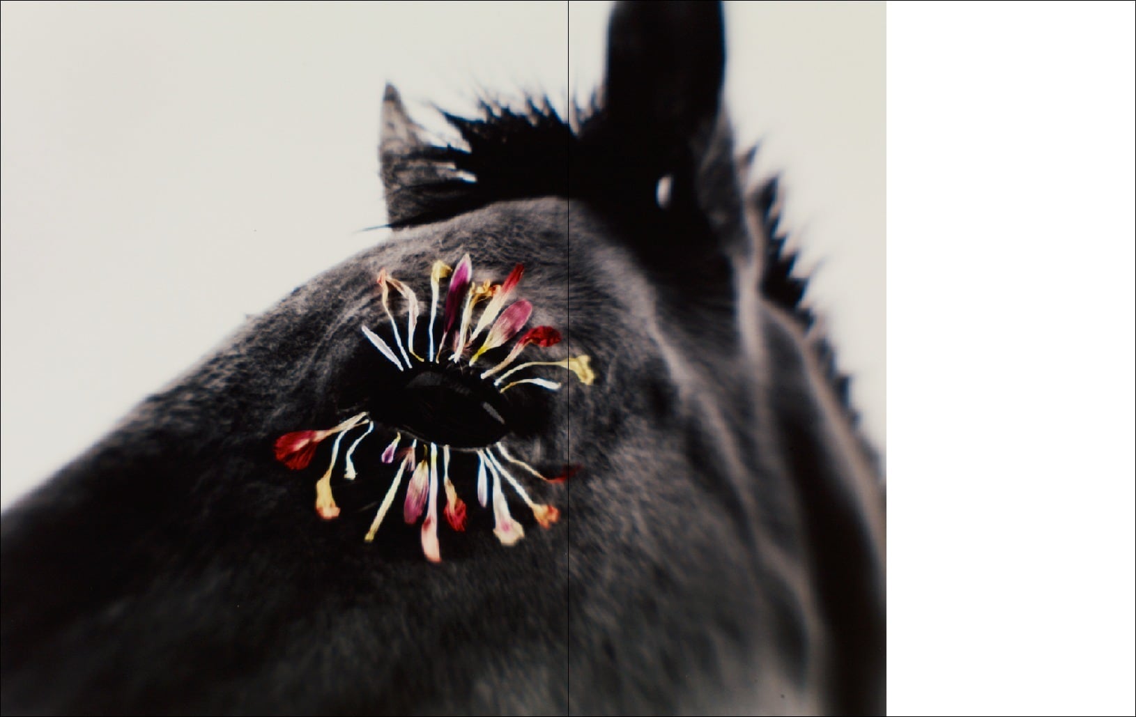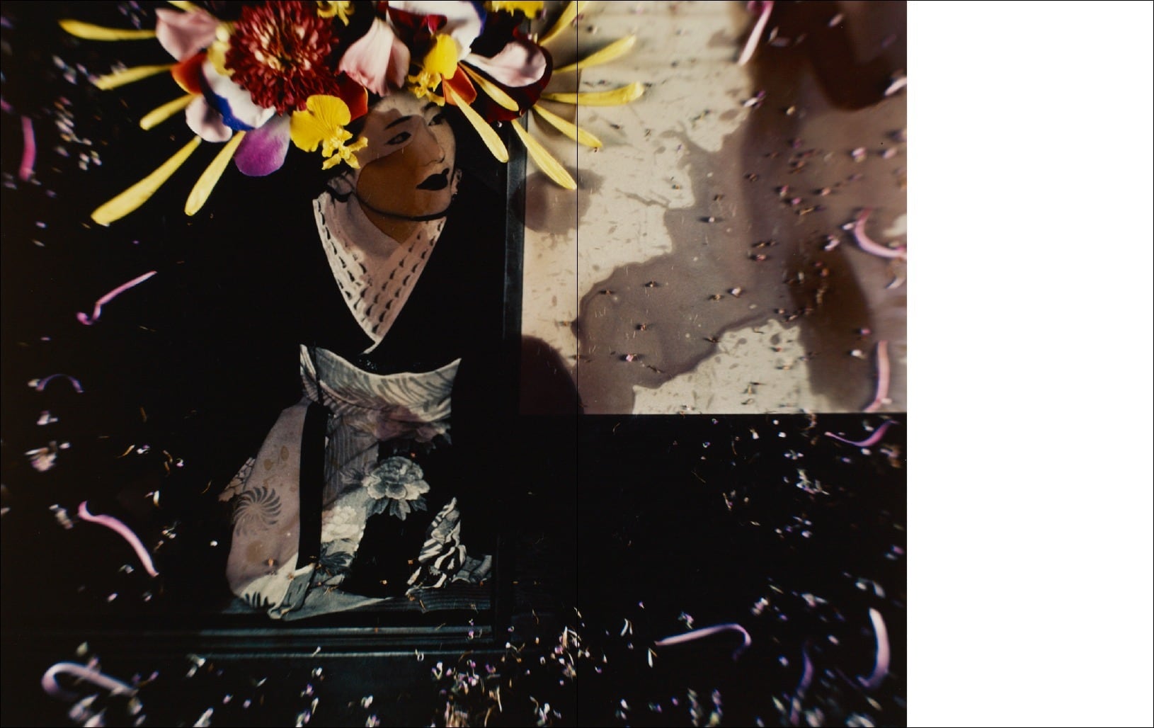 特筆すべきは、一見するとデジタルを駆使しているかのようなその作品に、じつはデジタル処理は一切していないということ。制作過程は極めてアナログで、長年撮りためてきた世界中のスナップ写真や、今回の作品のために撮り下ろした写真上に、一枚一枚本物の花を添え、一点一点丁寧にイメージを作りあげています。もちろん、すべてがオリジナルプリントです。